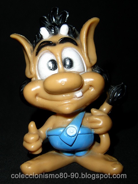 Este personaje se hizo muy popular en aquella época, por lo que se comercializaron diversos artículos orientados al público infantil. Entre ellos, estas figuras de PVC que muestro a continuación, una con su característico atuendo de aviador y las otras con su traje en colores azul, rojo y verde, fabricadas por Disjorsa en 1993.